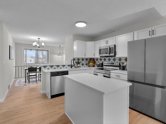 Welcome to this beautiful 3-bedroom, 2-bathroom townhome that seamlessly blends style, comfort, and functionality. Every detail has been thoughtfully updated, offering move-in ready convenience with contemporary elegance. Step into an open-concept living space featuring brand new flooring and fresh paint throughout. The heart of the home is the modern kitchen, complete with a large island, stunning quartz countertops, crisp white cabinetry, and sleek stainless steel appliances—perfect for meal prep, casual dining, and entertaining alike.