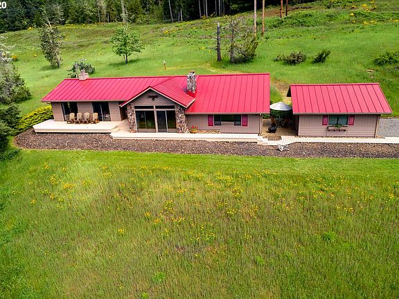 Superbly located, mid-century ranch w/ incredible views on amazing acreage, near rivers, lakes & outdoor activities. The home features, hardwood floors, stainless kitchen appliances & granite countertops, 2 wood burning fireplaces, fresh interior & exterior paint, red metal roof. 2 stall horse stable, tack & feed rooms, spacious two-car garage, & outdoor living space. Also, the home has a new water filtration system that was professionally installed by Coastal Range Water.
