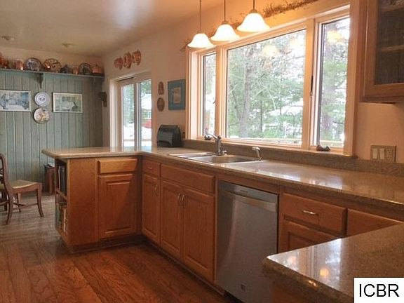 Attractive Bass Lake property features 4.1 acres and the very best incredible sandy beach on the lake! Excellent 168 feet of frontage ideal for swimming and sand castles alike! Level elevation, southern exposure, towering pines contribute to the northwoods feel of the exterior. On the interior of the walk out rambler home one will discover many lovely classic traditional details adding warmth and ambiance. Living and dining rooms are striking with rich engineered hardwood flooring, vivid colors, contrasting wains coating, French doors leading to inviting three season porch and large deck overlooking lawn and waterfront. Kitchen has a wonderful appeal with custom oak cabinetry, stainless steel appliances, Silestone countertops and recessed lighting. Master and second bedrooms are on main level.Lower level features family room with impressive split rock, wood burning fireplace, 3rd bedroom and combination wood working shop/storage and mechanics. Home has both forced and central air and backup generator accessibility. Also located on property are two detached garages, excellent for vehicles and recreational toys. Since current owners purchased they have replaced: windows, roof, septic, furnace, air conditioner, 14 KW generator, baths and kitchen.