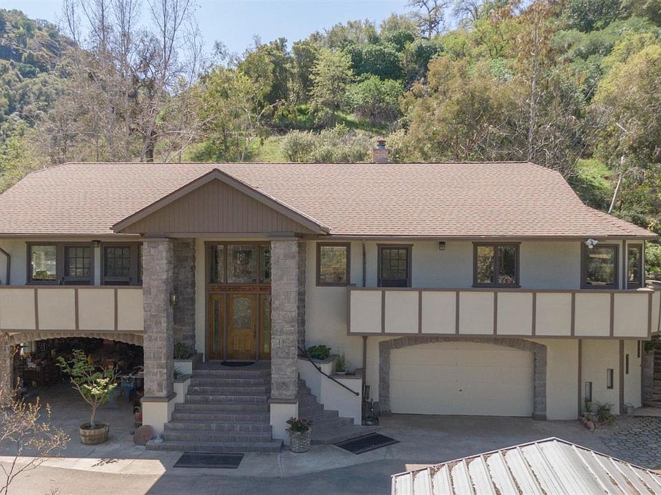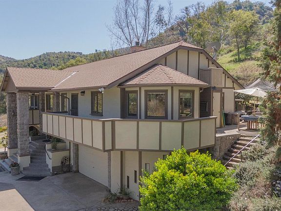 Inspiring 3/3 custom hand-crafted home on 5+acres. This elevated home consists of a 4- car garage with 9' doors, built in pantry, workshop, office and storage. It covers the entire footprint, giving each floor 1878 square feet, making possible uses unlimited. The home has many features including, a grand entry, lots of storage, custom cabinets, large master suite with soaker tub, multiple balconies, breakfast nook, large built in stainless electric oven, spacious kitchen, crown molding, customized laundry area, intercom and more. Some recent updates/replacements include roof, paint inside and out, well pump, rebuilt balconies, updated vinyl flooring and more. Exterior features include a paved driveway with automatic gate, fencing, large, detached garage, potting shed, spacious patio around goldfish pond, and 2 PG&E meters. The home is surrounded with gorgeous plant and tree specimens providing a multitude of blooms throughout the year creating your own private oasis. Beyond the home site there is a road to the top of the mountain that features breathtaking Mountain View's. The 4.9+- ac parcel next door is also available for sale with the home purchase, which would make a total of 10 acres.
