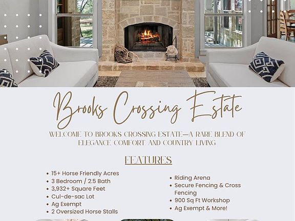 BROOKS CROSSING ESTATE – Offers the epitome of style, quality and craftsmanship wrapped up in a stunning custom-built home featuring 3 bedrooms and 2.5 baths, this 3,932+ square-foot masterpiece sits at the end of a quiet cul-de-sac on 15 horse friendly acres, surrounded by abundant majestic oak trees and beautiful landscaping, making for an ultimate private feel. Step inside and you're welcomed by exquisite beauty and a warm charming atmosphere at every turn. Beginning with soaring wood-beamed vaulted ceilings and rich wood accents that flow seamlessly from room to room, lending warmth and character throughout. The impressive entryway, flanked by grand stone pillars, leads you into a charming great room anchored by a floor-to-ceiling stone fireplace and expansive windows that bathe the space in natural light while showcasing breathtaking backyard views. The gourmet kitchen is a dream for entertaining, equipped with top-of-the-line appliances, a spacious island, deep sink, under-cabinet lighting, gleaming granite countertops, and an oversized walk-in pantry. Custom alder wood cabinetry provides ample storage, and the kitchen flows effortlessly into the dining area w/ built in serving station-an ideal spot to enjoy meals overlooking the majestic trees and acreage out back, with direct access to the back patio for seamless indoor-outdoor living. The spacious master suite encompasses an entire wing of the house and is a perfect blend of style and utility complete with a striking wood accent wall, intricate pan ceilings, beautiful views outside, and direct access to the outdoor living area. The spa-inspired ensuite bathroom features a Jacuzzi soaking tub, walk-in shower, huge roomy walk-in closet and his/her vanities uniquely designed with granite countertops and tons of hardwood custom cabinetry and storage. A well thought out split floor plan places the two additional guest rooms just down the hall. Both guest bedrooms are cozy and inviting, complete with tall vaulted ceilings, abundant natural light and generous walk-in closets, connected by a large Jack-n-Jill bath that offers separate rooms with their own vanities and a shared shower/tub. In addition, the home includes a spacious utility room with tons of storage and cabinetry, a large utility sink along with an office that can be easily converted to a 4th bedroom. But wait there is more! Off the kitchen, you'll find a cozy den with vaulted wood ceilings and a stylish powder bath, which opens into a huge family room—perfect for game nights, movies, or relaxing with friends and family. OUTSIDE - step outside to the expansive patio where you will spend a lot of your time sitting and enjoying the deer, birds and other wild life underneath a bed of oak trees. Multiple doors connect the patio to the living and kitchen areas, making this home perfect for entertaining. There's also a well-equipped well house with electricity, offering extra storage options along with an over-sized 3 car garage, giving extra space for off-road vehicles, motorcycles or storage. The landscaping includes automatic sprinkler system and lighting. Horses are welcome. A perfect spot for the equestrian lover! This property comes equipped with excellent horse facilities including 2 oversized horse stalls, a riding arena, and secure fencing and cross fencing. A 900 square-foot workshop with AC is ideal for woodworking, car enthusiast or any hobby you can imagine. Whether your passion is horses, livestock, or simply enjoying nature at its finest, this property has room for it all. Welcome to Brooks Crossing Estate—a rare blend of elegance, comfort, and country living.