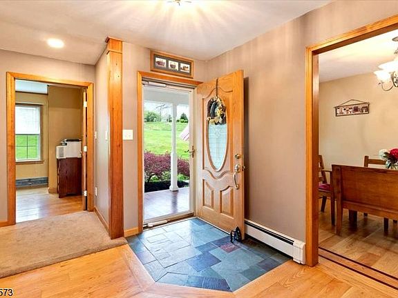 This pristine 7-room, 3-bedroom & 2-bath ranch enjoys a wide rocking-chair front porch and sits on 2.55 beautiful & mostly open acres featuring an oversized 30x25 2-car heated & air conditioned garage with 2 exterior doorways, auto openers, a generator hookup and an exterior RV hook-up; a full walk-out basement, and ceiling fans & wood flooring throughout (except 1-br). The spacious eat-in-kitchen is aglow with beams of sun flowing through the 2 large recessed skylights, and features wide-plank pine floors, inset lighting, stainless steel appliances, tile backsplash, an abundance of custom oak cabinetry and sliders to the expansive back trex deck. The lilght-filled 22x21 living room is accented by oak flooring, a bay window plus decorative transom windows, and a wood-burning fireplace with insert and natural stone surround. The dining room is highlighted by a wide-plank pine floor with decorative inlaid walnut. The 1st floor office/den was converted to the laundry room for convenience, however it can be reclaimed by moving the washer & dryer to the original hook-ups in the basement. The master bedroom has a walk-in closet and the tiled master bathroom with a shower stall. The 2nd bath has an oak vanity, tile flooring and a tub-shower. The nicely sized 2nd & 3rd bedrooms feature carpeting & wood flooring, respectively. There is also a 20x16 garden shed and a 28x21 detached carport, both with electric service!