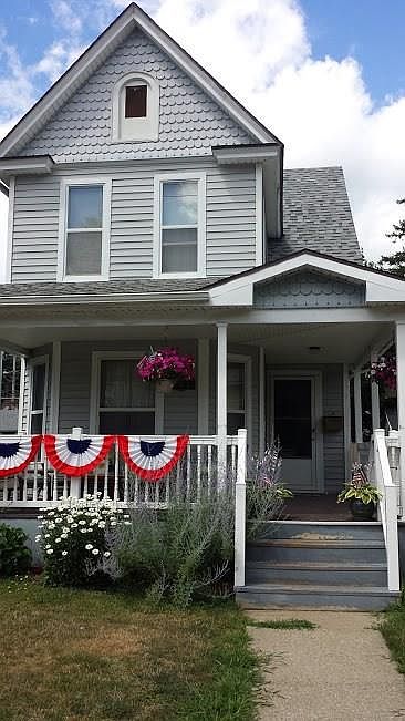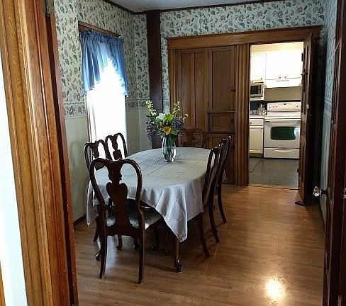 Charming 2 story home offering a wonderful flat lot, welcoming front porch, oversized 2 car garage with a workshop, nice deck and fenced in yard. The first floor has much charm and character with natural wood work and built in cabinet areas, formal dining room, plus dining area, great room plus a living room, first floor laundry and jacuzzi tub in the first floor bathroom. The upstairs offers nice hardwood floors, owners suite has a walk in closet, and very nice size bedrooms. This home offers newer vinyl siding, windows, roof, furnace with central A/C, and 200 amp electrical service.