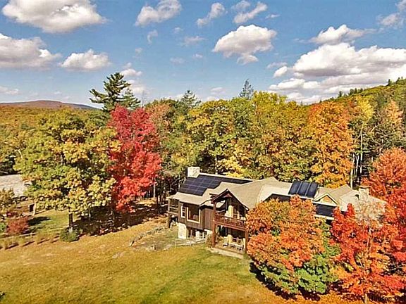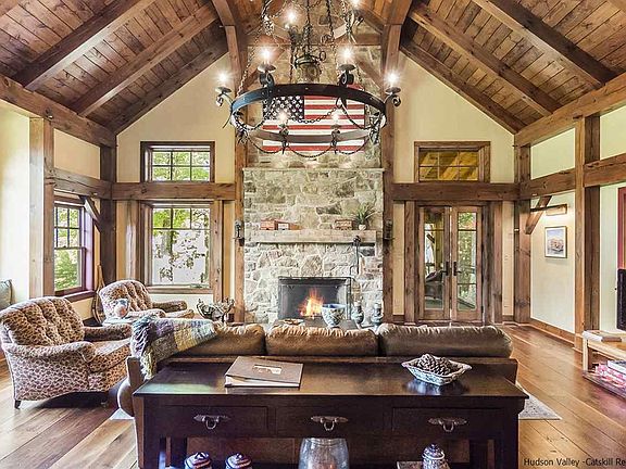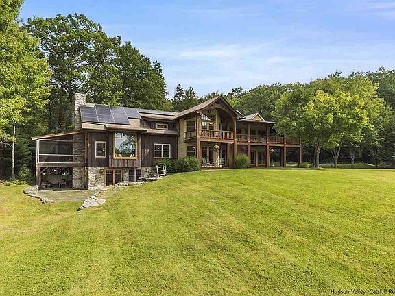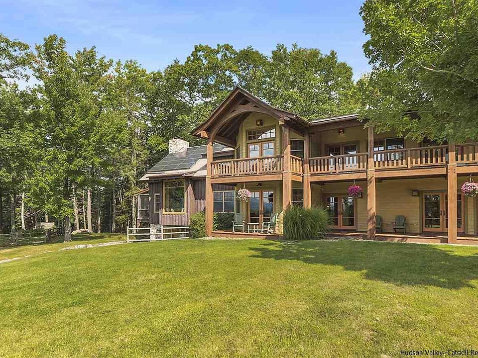 This Woodstock mountaintop retreat has mesmerizing panoramic Catskills views. It is so peaceful and quiet here - you can only hear the birds, bees and the whisper of the wind. Being here makes one want to take a deep breath in and simply enjoy! Aside from the wonders of nature from the level and useable meadow area and beyond to the intimate mountain vistas, the one of a kind main house is a perfect blend of Arts and Crafts with Adirondack style. Wide covered wrap-around porches span the entire back of both the first and second floors with glass doorways out from just about every room in the home. The first floor offers an open flow with a true cook's kitchen replicated from a Tuscan home where the owners spent time. A capacious dining area overlooks the views as well as the two-story high Timberpeg living room addition with massive stone fireplace, black walnut floors and an enchanting window seat -perfect for cozy winter days with a book by the fire. From there you continue to a screened in porch, also with a fireplace. The other wing of the main floor has a lovely bedroom with en suite bath and boasts a third fireplace. The walls are Tuscan plaster and give a very comforting "soft" feeling throughout. Heading upstairs there are three more bedrooms, two of which have access to the marvelous upper porch as does the substantial hallway/landing between the bedrooms. The Master suite has the most romantic balcony ever from which to stargaze and also expands to a large loft area overlooking the Great Room. This is a good office and lounging space. There is a full walk out basement ready to be finished which is already roughed out and could be more living space for guests or an au pair. Onward to the charming two bedroom chalet guest house and gorgeous freeform heated custom pool with spa, soothing waterfall and more of those glorious mountain views. State of the art solar systems for the main house and the pool plus a Buderus boiler and backup generator help keep the home running smoothly in all seasons. Also a two car garage and charging station for your cars. Have all you ever need right here! But should you want to leave, travel only 15 minutes in either direction to Woodstock or Phoenicia for great food, shopping galleries, music and theatre. Hiking and biking are literally out your door.