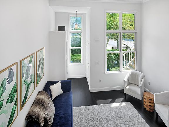 Stylish Albany style corner home on Southernmost row of community. Conveniently located near second pool, park, ferry bus stop, guest parking and bus to NYC!! Dark bamboo hardwood floors. Crown molding. Chair railing. Newer stainless steel appliances, quartz counters and custom subway tile back splash in gourmet kitchen. Marble floor and vanity in master bath. Custom shelving in closets. Customized full bath downstairs level. Newer HVAC and washer/dryer. Parking for two cars; one in private garage with sealed epoxy floors and one in driveway. Community features two pools with jacuzzis, tot lot, waterfront promenade, park, and free shuttle to ferry. Steps to 158 bus to NYC. Close to restaurants and shopping.