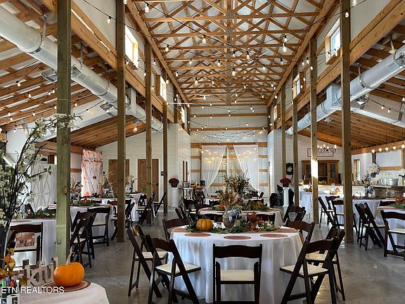 A major improvement on the property is a 40x80 pole barn constructed in 2022. The barn is fully enclosed and includes heating and air conditioning, providing year-round usability. Interior features include three bathrooms, a small commercial kitchen, and a bar area. The structure was designed with custom barn doors and premium finishes. A large rear deck extends from the barn and overlooks the surrounding acreage and pond, offering an elevated view of the property's natural features.