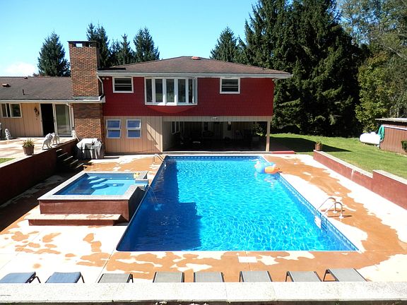 BEAUTIFUL~18 ROOM~PRIVATE ESTATE RANCH~NEW IN GROUND HEATED POOL W/ HOT TUB~15 ACRES!! Magnificence w/ in-town convenience. Features 5 bedrooms,3 full baths! Large master suite w/ attractive tiled full bath, whirl pool tub w/ large bay window over looking the heated pool! Charming kitchen,stainless appl, lg pantry,sliding doors to patio & pool area,huge cozy sun room,formal dining rm,lg bright living rm with FP,sunken family room w/ FP & wood stove & blue stone mantel,full finished basement w/wet bar & game rm,lg laundry rm & lg workshop,gorgeous entry foyer, his and hers cabana rooms leading to a lg covered deck along the front of heated in-ground pool,2 car over-sized garage,long private paved drive way and parking area, nicely landscaped peace-full lg yard & paths through the woods !!!