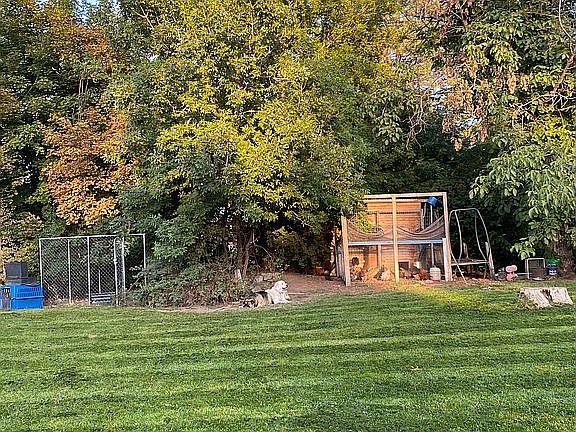 Multiple fruit trees (2 peach, 2 cherry, 2 apple, 1 pear), 35+ yr old walnut tree, hazelnut tree, strawberry patch and raspberry patch with 2 varieties. Large garden and 10x12 greenhouse. New cedar fencing across back yard and around garden. Circle drive and RV parking.