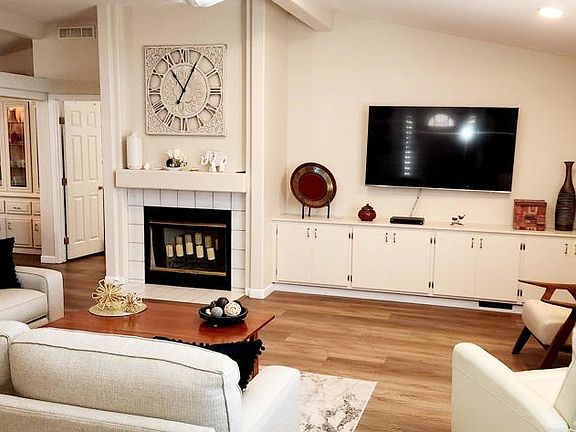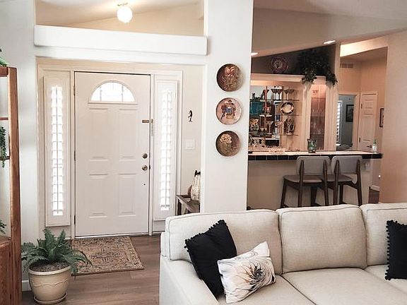 Welcome to your dream home! Beautiful 3-bedroom, 2-bathroom home offers the perfect blend of modern design and comfortable living, built in 1999 and meticulously maintained. As you step inside, the true formal entry creates a warm and inviting first impression, leading to the heart of the home where you will find stunning high-end wood-look vinyl plank flooring, high ceilings with skylights, a built-in wet bar and the fireplace adds so much charm to this wonderful space. The kitchen is highlighted by a nice size island with Quartz counters including, modern built-in appliances, and cabinets galore adding an abundance of storage. Large windows with Shutters, Ceiling fans throughout and mini split units help to keep the home cooler during the warm summer months. The owners en-suite has an extra-large closet, dual vanities, separate tiled walk-in shower and soaking tub. This is a split floor plan with two guest bedrooms and an updated bath on the opposite side of the home. Large Garage has plenty of cabinets and ample space for your vehicles. Outside you'll find lush landscaping, complete with a sprinkler system, and many patio areas including the Tranquil back enclosed patio, great for entertaining or quiet nights. Private cul-de-sac location, you OWN the land and the low $400 monthly HOA fee includes FREE GOLF, Cable TV, Internet, trash removal, 24/7 Guard Gate Security and so much more!