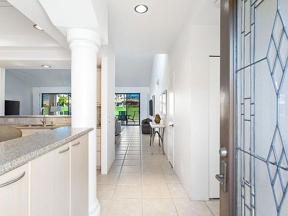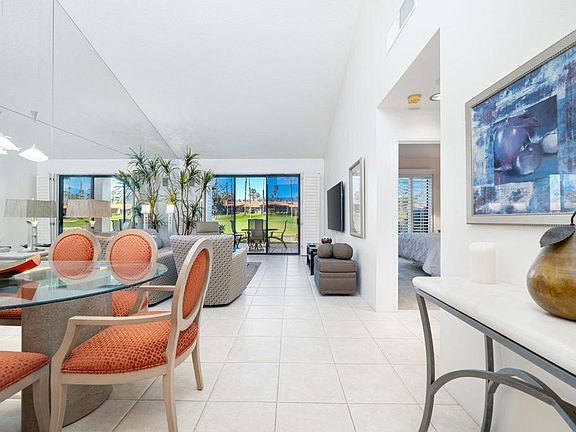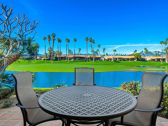Lovely waterfront condo with west facing views, flowing palm trees, lush golf course, spectacular sunsets, one door away from a community pool & short walk to clubhouse & tennis courts. Located in Palm Valley Country Club known for being the most friendly, fun, & best deal in the desert with 2 beautiful 18 hole Ted Robinson golf courses (one championship & one executive), reasonable golf fees, and perfect location: Just 10 minutes from El Paseo, ''The Rodeo Drive of the Desert'' & 30 minutes to Palm Springs airport. Upgrades & special features include, custom entry door, clear tinted patio sliding glass doors, plantation shutters in great room & bedrooms, newer carpet in both bedrooms, motorized window blinds, patio awnings, stainless kitchen appliances, 75'' Tv, built-in BBQ, granite counter tops, remodeled kitchen & turnkey move-in ready including golf cart! Palm Valley Country Club is a private guard-gated community with large gym, fitness center & Spa, 13 Tennis Courts, 12 Pickle Ball courts, 46 Community Pools & Spas, two restaurants & Beauty salon. Monthly HOA dues include security, cable, wi-fi, ext paint, roof maintenance, landscaping, ext water, trash, pest control, all for lock and leave stress free living. A proprietary easement fee of $161/month gives a social membership to every homeowner for Clubhouse/ Dining & social events. Additional membership programs for golf or tennis are available at very reasonable fees. Come join the fun!