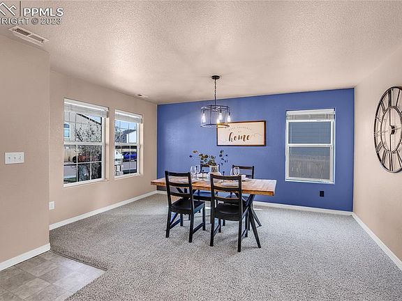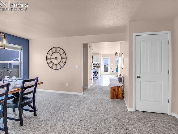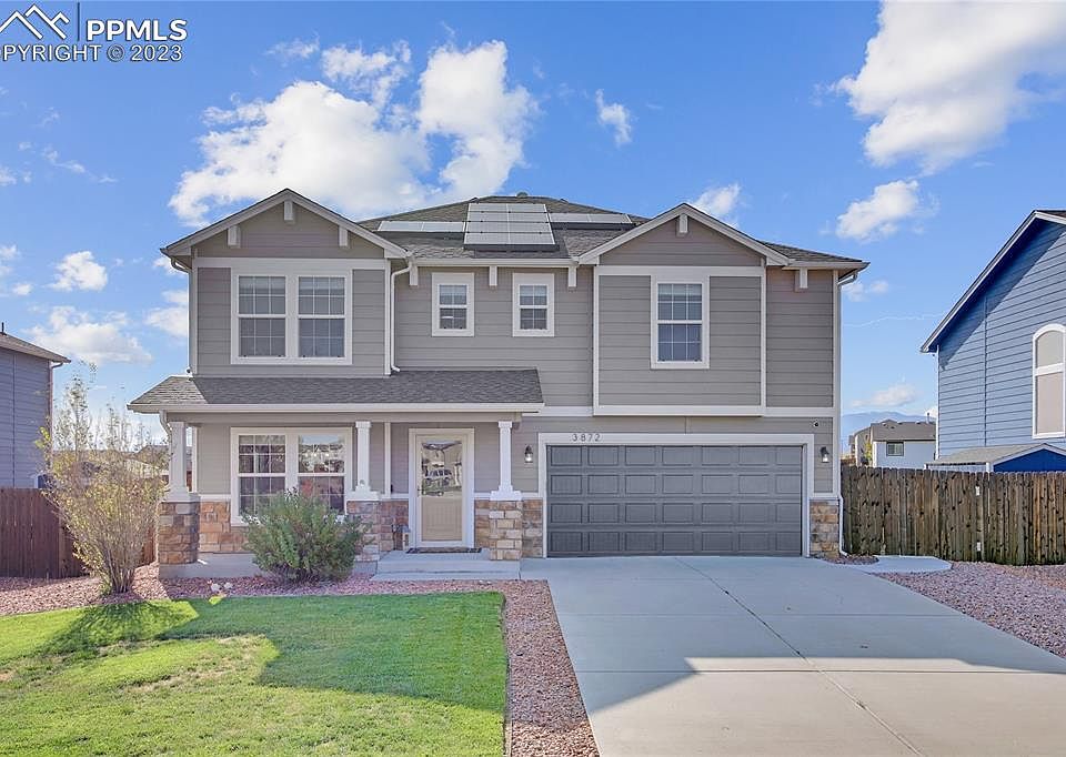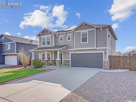 Welcome to this well maintained two-story single-family home with an inviting open floor plan! This charming residence offers a range of modern amenities that enhance your living experience. A spacious kitchen awaits you, complete with a pantry and recently upgraded stainless steel appliances. Cooking and entertaining will be a breeze in this well-appointed space. Upstairs, you'll discover a generously sized family room with a cozy gas fireplace, providing the perfect ambiance for gatherings or relaxation. Convenience is key with a large laundry room on the upper floor, making laundry day a breeze. The expansive master suite boasts a five-piece bath and a substantial walk-in closet. The modern master bath features a stylishly updated shower enclosure with tasteful tile work and niches, as well as updated tile flooring. You'll also find a modern fireplace above the soaking tub, creating a tranquil atmosphere. Ceiling fans have been thoughtfully added in the living room and master bedroom, ensuring comfort and energy efficiency. The home features newer LED lights throughout the upstairs, adding a touch of modernity and efficiency. The property backs to open/buffer space, providing a private backyard setting. Enjoy mountain views from the comfort of your upper Western facing windows. The backyard is fenced in, offering a safe and secure space for outdoor activities and pets. Stay comfortable during the summer months with central air conditioning and a Nest thermostat. A one-year-old solar system will be fully yours, providing an eco-friendly and cost-efficient energy enhancement. This home is conveniently located near Peterson Air Force Base, Schriever Air Force Base, and Fort Carson. This property is in exceptional condition and ready for you to move in. Don't miss this opportunity to make this wonderful house your new home!