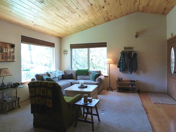 Enjoy watching the sunrise on the front deck of this cozy logsided cabin...an ideal mountain getaway! The corner lot location provides privacy & seclusion as well as additional parking space. Step into the charming greatroom that features a vaulted rustic pine wood-lined ceiling, 2 large picture windows, quaint elevated gaslog stove with stack-stone wall surround & sliding glass doors out to the expansive rear deck. Well equipped kitchen complimented by hardwood floor. Stack washer/dryer. Both bedrooms have 2 large windows that bring the outdoors inside, closets with built-ins & neutral toned carpet. There is a lower deck that is set up for a spa. Nestled in the treed backyard is a fire pit. Under the cabin is a rain water catchment tank. A small corner of Lot 59 is in floodplain