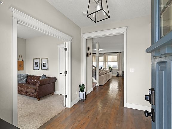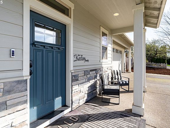 Thoughtful functionality meets refined design in this beautifully crafted 5-bedroom, 2.5-bathroom home! Nestled on a desirable corner homesite in one of Newberg’s most sought-after neighborhoods, this 2,750 SF home offers the perfect balance of comfort, style, & practicality.From the moment you arrive, the classic curb appeal and inviting covered porch set the stage for what’s inside. Step through the front door to find an open great room layout featuring engineered hardwood floors, deluxe molding, and modern touches throughout. The spacious family room is highlighted by a striking accented gas fireplace, making it the perfect gathering space. The contemporary kitchen is truly the heart of the home, boasting quartz countertops, a full-height tile backsplash, an island with an eat-bar, & a convenient pantry for extra storage. The adjacent dining area flows effortlessly to the extended covered patio, creating an ideal indoor-outdoor living experience. The main level includes a versatile bedroom with French doors—perfect for guests, an office, or a hobby space—plus a stylish powder bath. Upstairs, retreat to the vaulted primary suite, featuring a walk-in closet & ensuite with a dual sink vanity, a tiled walk-in shower, & a moody accent wall. Three additional well-sized bedrooms, a bonus room with an arched accent wall, & a laundry room with built-in cabinetry & a folding station complete the upper level. Every square foot is maximized with purpose. Outside, the fully fenced backyard is designed for both relaxation and entertaining, with a covered patio, a raised sitting area, plenty of space to play & boat/potential RV parking!! Additional features include central air conditioning, a two-car garage with 220V for an electric car, plus an extra 220V outlet in the primary suite. Located just minutes from wineries, downtown Newberg, top-rated schools, shopping, and dining, this home is ideally situated for both everyday convenience & weekend escapes to wine country!