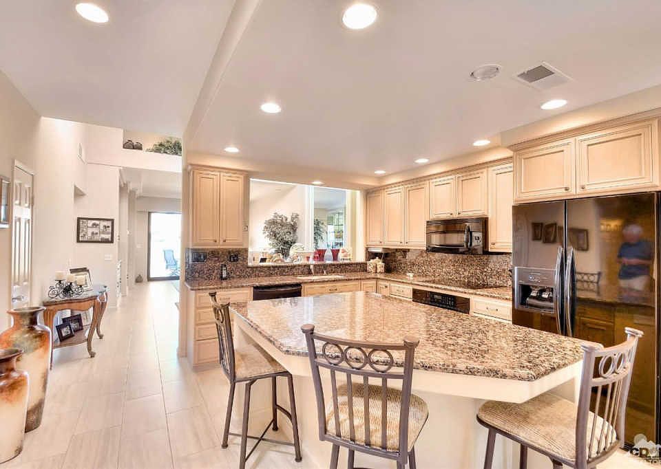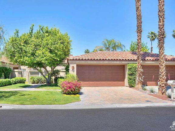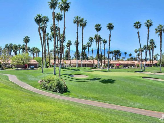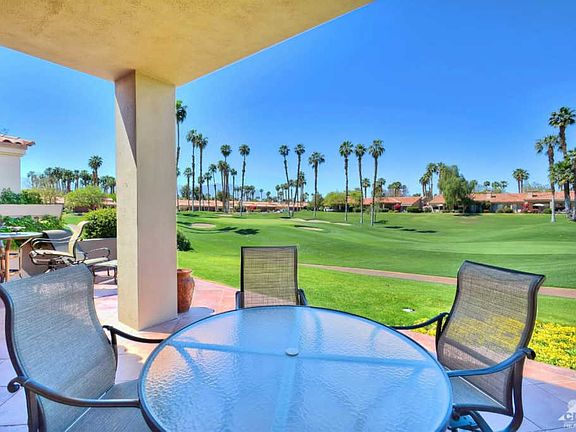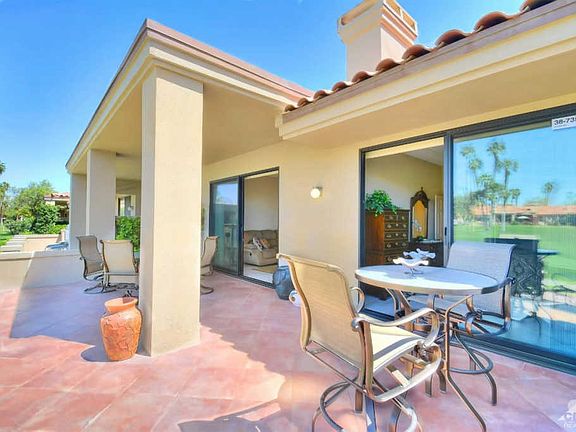 Offered furnished. A room was added to this 1989 Jacaranda plan. The Assessor still shows 1330 SF but the owner states there is 1490 SF of useable space. Buyer to verify. This bonus room has a built-in desk and slider access to the front patio so it could easily become a 3rd bedroom with a private entrance. The seller spent a fortune remodeling the entire home. The front courtyard has new pavers, an upscale BBQ built into a custom island and a cut glass front door. All windows and sliders were replaced. Every room has beautiful, modern tile. The kitchen has amazing granite, new appliances, quality cabinets w/knobs and a stool height island. The gorgeous dining area has a soaring, coffered ceiling. The great room has new cabinets, a wet bar, speakers in the ceiling. Both baths have new granite counters, and zero threshold glass enclosed showers; no tubs. The rear patio was extended & finished. Spectacular views of the 18th green and Mt San Jacinto. Garage has cooling and storage.