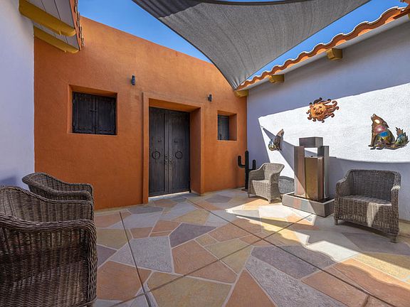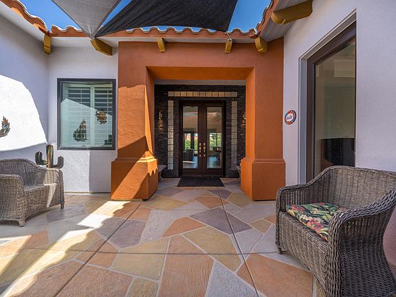 This Solar powered home is the one you have been searching for; the moment you pull up you will fall in love with the curb appeal of the private gated front courtyard, desert landscape and pavered driveway. The perfect open layout offers 4 bedrooms, 3.5 bathrooms (including a casita off the courtyard), double glass entry doors to a foyer, dining room & great room with fireplace. The modern finishes throughout include a contemporary kitchen with metallic backsplash & 2 beverage refrigerators, tile floors and designer color scheme. The newer windows & sliding doors are energy efficient and fill the home with natural light. Also, 3-car garage with epoxy finish, home water filtration and security system with cameras. The oversized rear yard is a water efficient private oasis with a solar heated pebble-tec salt pool with inset palapa, soothing water features, covered patio, motorized awnings & screen, outdoor shower, built-in BBQ with bar, artificial turf & mature landscaping create the ultimate desert lifestyle!