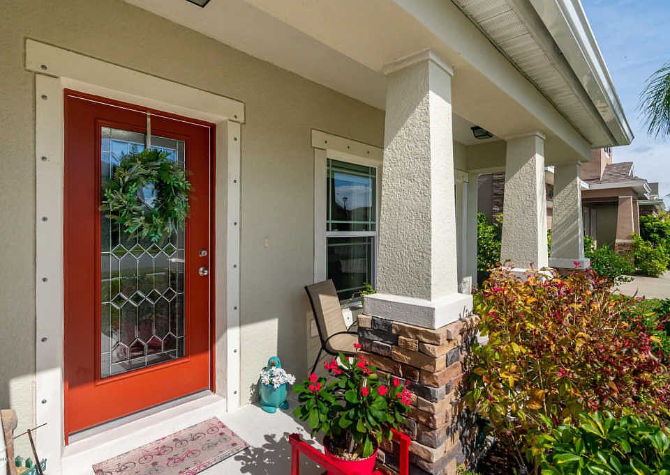 Impeccable home w an amazing backdrop of nature sanctuary. Bright & flexible floor plan w gorgeous porcelain tile in a light weathered wood plank look. The kitchen has espresso colored cabinets, granite tops, deep 2 vessel sink, kitchen island, recessed lights, SS appliances & sliders to the extended lanai & reinforced screen overlooking the beautiful landscape & birdlife. Master bedroom w tray ceiling, new fluffy carpet, two windows, WI-closet, double sinks & WI-shower w glass doors. Exterior just painted, trussed front porch w a stone elevation, gutters in front & back, storm shutters on all windows. Central quiet location w underground utilities, sidewalks & just min to multiple shopping malls, beaches, recreation & nature. A rated schools, low HOA, insurance & taxes.
