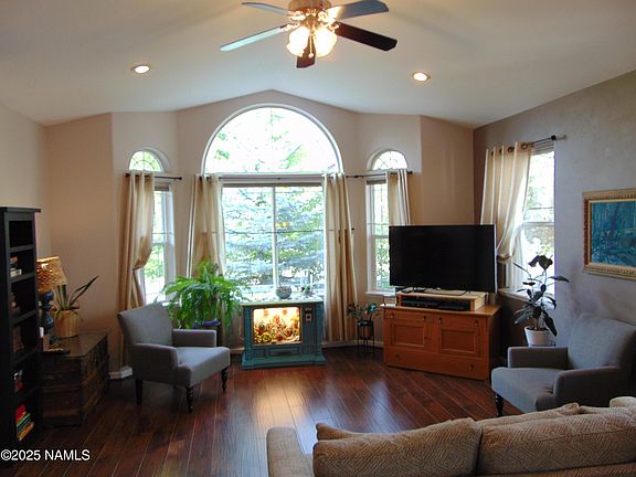 This 4-bedroom, 3 1/2-bath Flagstaff home of light is filled with natural light from expansive windows and skylights, creating a warm and inviting atmosphere. The main level offers open living spaces with treetop views, while the fully functioning walk-out basement provides flexible options for guests, multi-generational living, or rental income. A stunning garden with mature trees offers a peaceful outdoor retreat, complete with a deck and spiral staircase. Energy efficiency is built in with owned solar panels. With spacious bedrooms, modern comforts, and a blend of indoor-outdoor living, this property is a true Flagstaff gem.