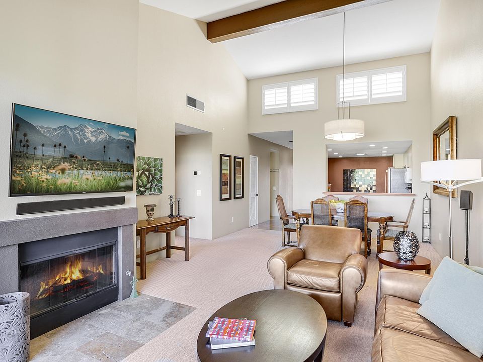 Beautifully appointed and ready for your touch - 3 BR / 3 BA fully furnished unit off the 18th hole. This 1,682 sq. ft. condo is move-in ready and features a combination of tile and carpeting along with high ceilings in an open floor plan concept combining the living, dining and kitchen areas into one. Living room with fireplace and wet bar opens to your patio where you can drink your coffee or have a cocktail while enjoying beautiful golf course views sitting high above the 18th hole. 2 bedrooms feature en-suite baths with one bedroom having a jack and jill bath for visitors. Unit features an indoor laundry room, a combination of tile and carpeting along with cathedral ceilings providing a spacious and open feel throughout the condo. Condo also has a 2 car garage including extra room for storage. The Palm Valley Country Club features a centrally located 100,000 square foot club house with a main dining room, two restaurants and lounge; 24-hour manned security entrance; Ted Robinson Championship and Challenge golf courses; lighted tennis courts and a Spa and Athletic Club with Olympic-size pool and full-service spa, sauna and steam rooms.