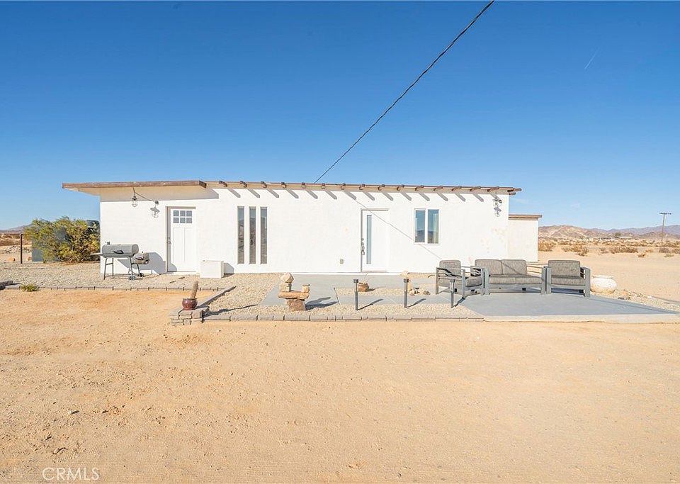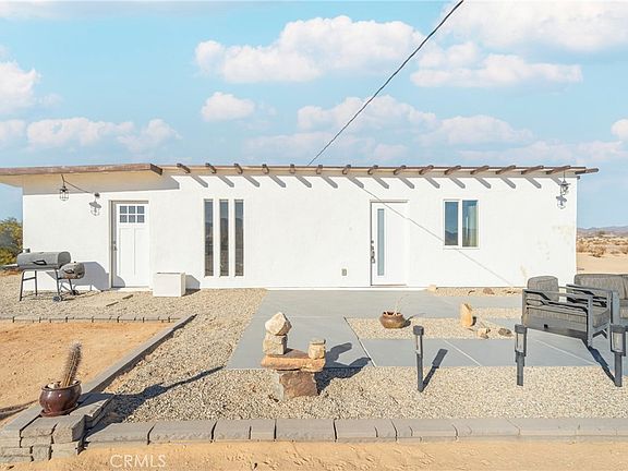 Welcome to Gopher Road in 29 Palms! A single family residence (SFR) NOT a cabin! Where tranquility meets modern living on a serene 5 ACRE LAND. This recently renovated residence exudes an AirBnB aesthetic, characterized by vertical windows that infuse the living space with contemporary elegance and abundant natural light. The bathroom is a standout feature, showcasing floor-to-ceiling tiles and a chic vanity fitted with a premium faucet. Cdustom gorgeous glass and maple french doors, Newly installed horizontal clerestory windows, custom gorgeous glass and maple french doors, provide stunning horizon views while ensuring privacy and reducing direct sunlight exposure. An outdoor patio serves as a perfect retreat for savoring morning coffee at sunrise and enjoying the night sky's beauty. The presence of government-owned land nearby guarantees a peaceful atmosphere, free from disturbances. The breathtaking panoramic vistas of the mountains within Joshua Tree National Park enhance the property's allure. Although enveloped by vast wilderness, the famous Palms Restaurant, celebrated for its live music, is conveniently located just minutes away. Situated in the emerging Wonder Valley, this property offers a respite from the bustle of tourists and traffic, capturing the quintessential Joshua Tree spirit that attracts individuals from across the nation and beyond, all in search of nature's tranquility and a sense of community—while still being a short drive from the shopping and dining options in downtown 29 Palms.