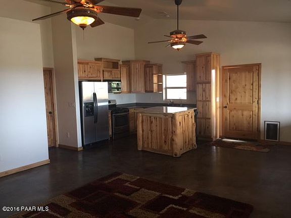 Country Living with forever views! This 3Br/2Ba ranch style home with metal roof offers knotty hickory cabinets, doors and trim throughout, kitchen island, great room, Jetted tub, remodeled master shower, stained concrete floors, climate controlled storage/workshop, fenced garden, covered porch for outdoor living. This Cozy Site Built Home is situated on 4+ Acres. Perimeter Is fenced and has 4 horse covered stalls and a huge flat area that can be used for an arena or run outs. Borders State Trust Land. Views that go on forever!!