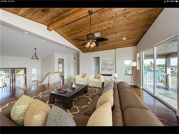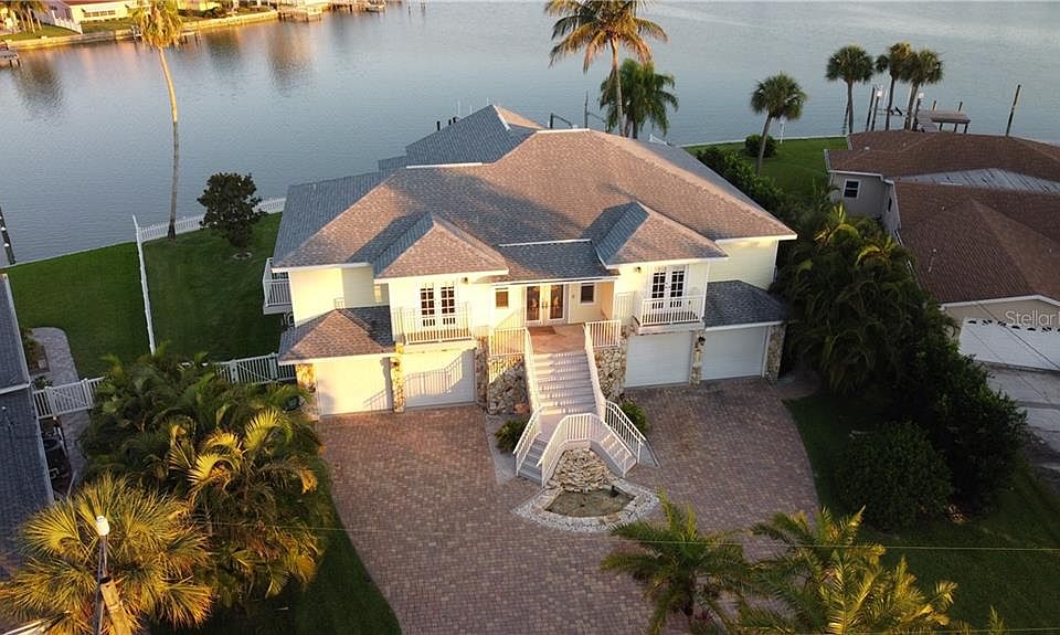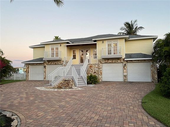 Built in 2007 to hurricane code this 3 bed, 2.5 bath plus office home has over 2400 sq ft and an oversized, 4-car garage. 127ft of waterfront, in-ground pool located in beautiful St. Pete Beach, FL. A short stroll - and just moments away are shopping, dining and the beach. Circular brick paver driveway, with an eye-catching stone waterfall. Lush tropical landscaping encompasses an exquisite double staircase leading up to the stunning custom 8 ft high double wood & glass entry doors. Through the entrance doors, you can go downstairs into the oversized, 4-car garage with epoxy flooring, or upstairs into the massive great room that is absolutely perfect for entertaining, but can also be arranged for comfort and coziness. The great room has over 12-foot high wood vaulted ceilings and stunning NEW wood floors. The back patio runs the entire length of the house at over 40-foot long with amazing water views. Sunrise or sunset, you will enjoy spending time and entertaining on this very large back patio. Master suite has his and hers closets, and a master bathroom you will love getting ready in! Bathroom has designer granite a spacious shower that is masterfully tiled, and includes a multi-head shower with rain-shower feature. Bedrooms 2 & 3 are quite spacious and supported by a private Jack-n-Jill bath complete with granite/wood vanity and a lovely shower/tub combination that your guests will fully enjoy. All the bedrooms and great room offer cherrywood flooring. The bonus room can double as an office space or play room. There is also a guest bath and laundry room on the main level. All the bedrooms have private balconies. The attractive lower level opens to an immense 1000 sq ft covered patio inviting you to the pool and waterfront area. Brick pavers cover the lower level deck and pool area. Deep unrestricted water access to The Gulf, Boca Ciega Bay & Waterfront restaurants all within moments of your dock. 127 ft long seawall with a double boat lift for multiple water crafts.