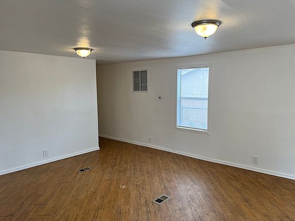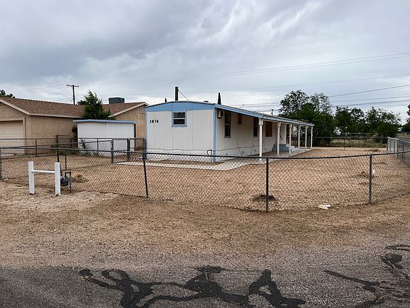 2 bed 1 bath manufactured home on a corner lot with new paint inside, covered patio the length of the home, two new AC wall units, Evap cooler, central gas heat, lights in all rooms, fenced yard with two areas for parking, and Laundry hookups. Trash is included