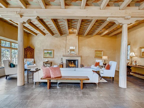 'Livable art' describes this elegant 4300 sq. ft., (3 bedroom/3 bath plus office) home with a magical collaboration between artist Lisa T. Bemis, architect Beverly Spears and builder Tony Ivey and winner of the AIA 1994 Residential Design Merit Award. This enchanting property, which is sited on 1.26 acres and minutes from Museum Hill/Canyon Rd, has a bucolic feel and views of the Jemez mountain range from the backyard and additional Sun/Moon Mountain views from the front portal. Built in 1992 and constructed of pumice crete, the walls are thick and the divided light windows are framed by that depth. The ceilings were hand-painted by Bemis...plank by plank and add to the exceptional creativity of this elegant home. The master bedroom is located on the second floor with a private balcony and Jemez views and Bemis hand-painted the bathroom windows to create the illusion of delicate lace curtains. The office is attached with a private entrance, but is very separate from the main living areas; thus, a perfect home office. The detached 2-car garage is connected to the house with a lovely, long portal. This home is superlative in its design, in its location for privacy yet with easy downtown accessibility, and its access to the trail system (directly across the street from the Sun Mountain trailhead).