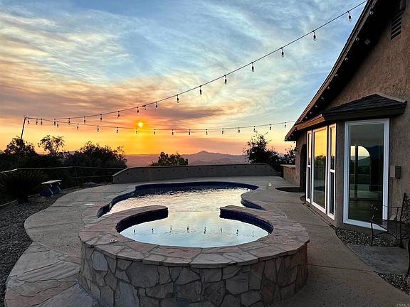 This incredible Jamul mountain top estate was the builders lot, enjoying 3.42 acres of panoramic views. Soak in the sunset over Point Loma and the downtown San Diego skyline. Just 30 minutes from San Diego Airport and 6 minutes from Rancho San Diego, this property offers rural serenity with city convenience. A private gate and driveway lead to an open floor plan featuring two living areas, two fireplaces, a formal dining room, and a chef’s kitchen with natural stone countertops, upgraded appliances, and a premium gas cooktop. The main level includes a bedroom with an accessible bathroom that has been newly remodeled. Large picture windows on the entry level showcase the beautiful landscape surrounding the home. The exterior features a spacious fenced yard, patio, pool, hot tub, built-in BBQ, sink, and pool table—ideal for warm evenings under the stars. Upstairs, the primary suite includes a fireplace, private balcony, soaking tub, and walk-in closet, plus three additional bedrooms. Recent updates include fire-rated vinyl windows, plantation shutters, luxury vinyl plank flooring, gas cooktop conversion, fresh interior paint, and an owned rooftop solar system. Additional features include a 3-car garage with a full bathroom, two RV hookups, a horse corral, a tack room, private trail access to McGinty Mountain, and multiple citrus trees. A nearly 800-square-foot detached garage offers potential as an accessory dwelling unit (ADU) or workshop. This estate combines tranquility and spacious living, ideal for those who cherish incredible views, privacy, and entertaining. This one is a must-see!