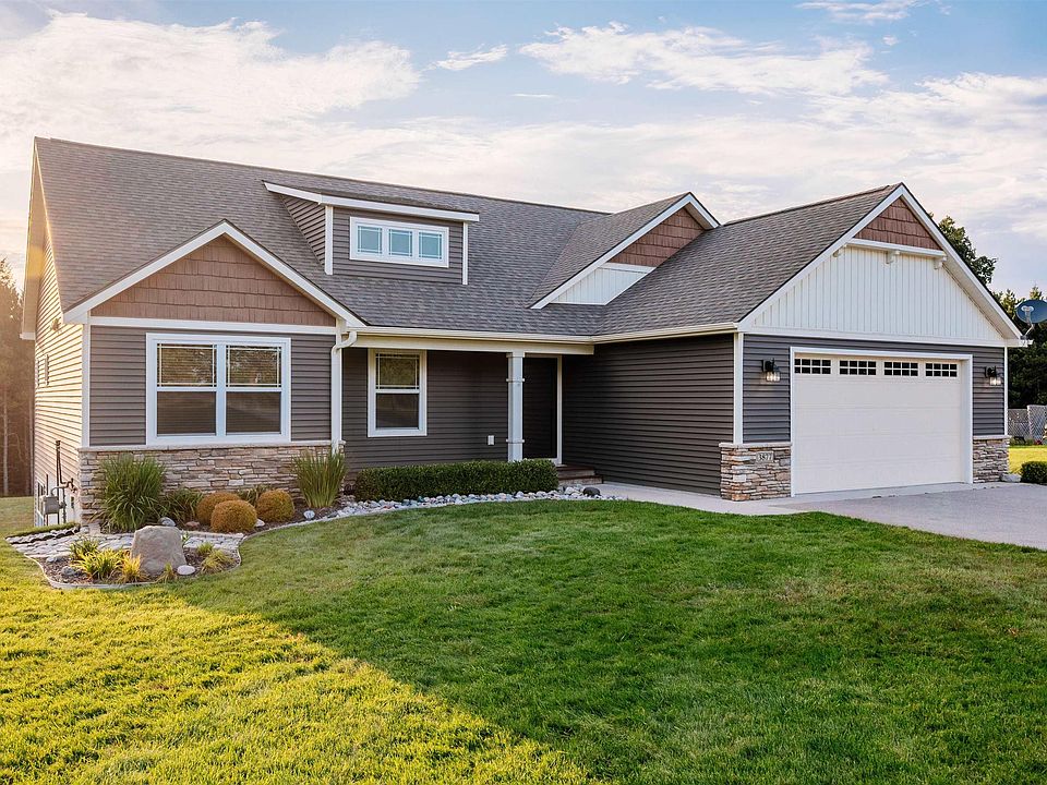 This 3-bedroom, 2-bath home sits on just over an acre, featuring a huge front and backyard—plenty of space to spread out and enjoy the outdoors. The main living area has vaulted ceilings that make it feel open and airy, with a great flow from the kitchen to the dining and living spaces. The primary bedroom features tray ceilings and a walk-in tile shower in the ensuite bath, and the spacious laundry/mudroom off the garage is super functional with room for storage and gear. Don't forget the large walkout basement, which is already wired and plumbed and ready for drywall or keep it the way it is which is perfect for storage, hobbies, or a home gym! Out front, the covered porch is a great spot to relax with coffee, and the elevated back deck is perfect for grilling or catching some sun. Tucked just around the corner from Moomers and only a quick drive to Long Lake or downtown Traverse City, you’ll love the quiet setting with everything close by! Enjoy Thanksgiving in your new beautiful home!