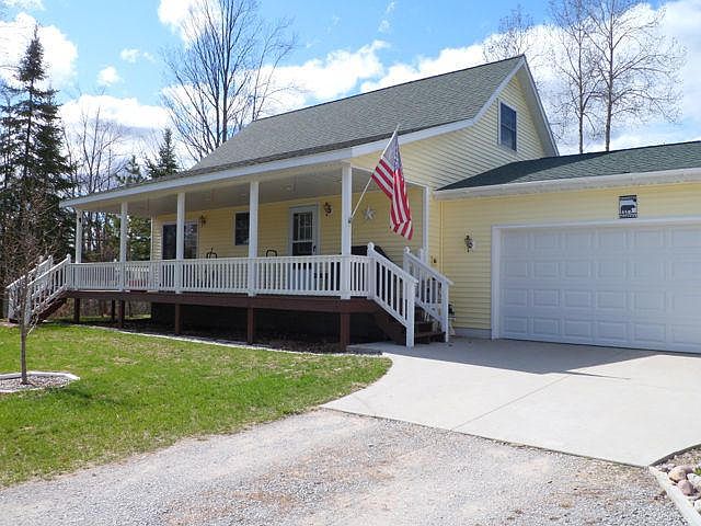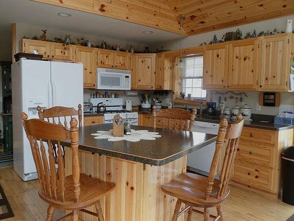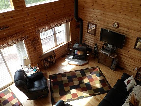 2007 construction, open floor plan, pine interior, oak hardwood floors in living/dining/kitchen, pine custom cabinets in kitchen, loft has sleeping area and half bath, ceramic tile flooring in 3/4 bath and entry, fireview wood stove in living, A/C, LP auto generator, full basement, attached garage, detached drive through garage/workshop, garden area, landscaped, near golf course.
