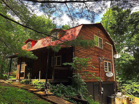 Very private log cabin nestled on 3.49 acres. Creek at back of the property. Beautiful wooded view from screened in back porch. Full unfinished basement. Detached garage. Metal roof. Fireplace. Large kitchen & living room on main level. Being sold as -is.
