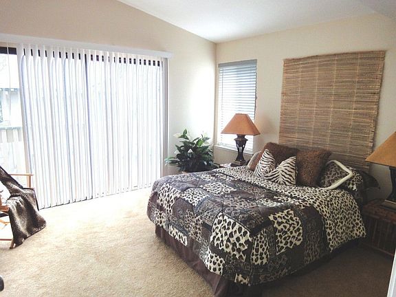 Beautiful townhome style, 2 master suites upstairs both with private balconies, vaulted ceilings, new paint, carpet and fixtures in bathrooms. Nobody above or below. Downstairs is a sparkling kitchen, dining area, family/living room, half bath, front and back patio and deck. Attached 1 car garage plus additional covered carport. Refrigerator, washer, and dryer stay. NO WAIT - regular sale, move-in condition! HOA dues currently $292, which includes pool, water, garbage, and insurance.