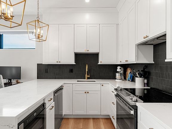 Vented out stoveSkyline city viewsStainless appliancesStriking backsplashTons of natural lightGorgeous wide-plank floorsQuartz counters