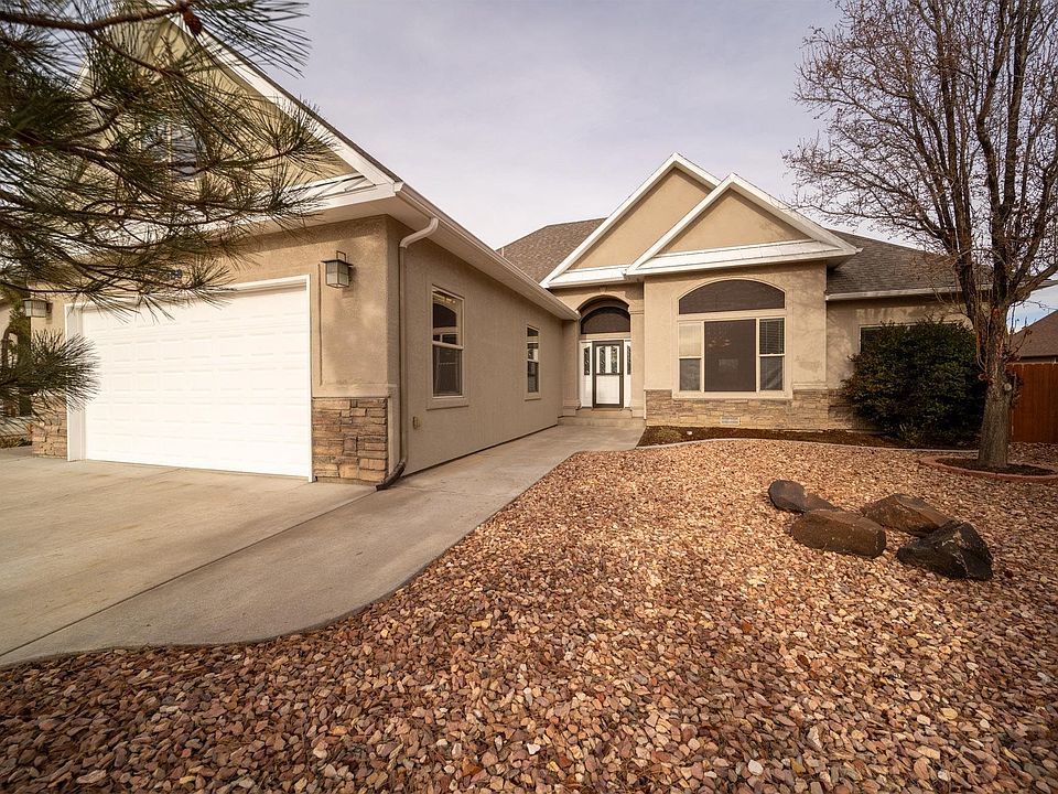 Western Slope living at its best. Within walking and biking distance of everything that Fruita, Colorado, has to offer; downtown shopping/restaurants, schools, community recreation center, library, hospital, parks, walk/bike paths, community festivals, farmer’s market, and a vibrant arts community. Plus, just minutes away from all the outdoor recreation that the Western Slope is famous for; mountain biking, hiking, rafting, climbing, skiing, and off-road trails. This beautiful stucco residence, nestled on a peaceful Cul-de-sac, offers the perfect blend of comfort, style, and low maintenance. With either four bedrooms or three bedrooms and a bonus room, this home is designed to cater to your lifestyle needs. The mountain views of the Bookcliffs from the back patio and the Monument from the front of the home add to the setting of this exceptional property. The professionally designed landscaping includes a xeriscaped front yard and a large backyard with ample space for outdoor activities and entertaining, making it an ideal oasis for both relaxation and play. The back patio features a low maintenance pergola and a natural gas outdoor grill, creating the perfect space for outdoor entertaining or quiet moments of reflection. Step inside to discover an inviting open concept layout that seamlessly connects the living, dining, and kitchen areas. Vaulted ceilings and a charming gas log fireplace create a warm and spacious atmosphere, making this home perfect for gatherings with family and friends. The kitchen is a joy to work in, featuring newer stainless-steel appliances and Corian countertops that blend style with functionality. Whether you're preparing a casual dinner or hosting a special occasion, this kitchen is sure to deliver. The large primary suite is a sanctuary of comfort, offering a seating area, a beautiful 5-piece bath with a walk-in shower, jetted tub, private toilet area, plus a walk-in closet. Upstairs, a bonus room with a half bath provides additional living space, perfect for a home office, playroom, or guest suite. The seller has contracted to complete the painting of the home’s exterior when temperatures permit. The trim has already been painted. The buyer can choose stucco color if an offer is made prior to work restarting. This home is designed for modern living, offering a perfect balance of style, comfort, and functionality. Don't miss the opportunity to make this Fruita, Colorado, gem your forever home! Schedule your showing now!