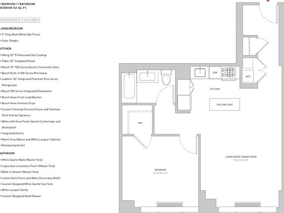 Luxurious, spacious, and serene one bedroom condo at 388 Bridge Street. With over 750 square feet of space, this apartment boasts an expansive living area with an open kitchen concept that includes a Liebherr refrigerator, Viking gas cooktop, and Bosch convection wall oven, white quartz countertops and backsplashes, custom fixtures, and a rolling island that provides flexibility on the kitchen's orientation. Large, sunny windows feature city view of Brooklyn and drench the apartment in natural light. The bedroom is king-sized with a large walk-in closet, and also features a large window with built-in covers for optimal light control. A large mirror, white lacquer vanity with a cast sink, and tiled walk-in shower dress the bathroom. The apartment also features an in-unit Bosch washer/dryer.