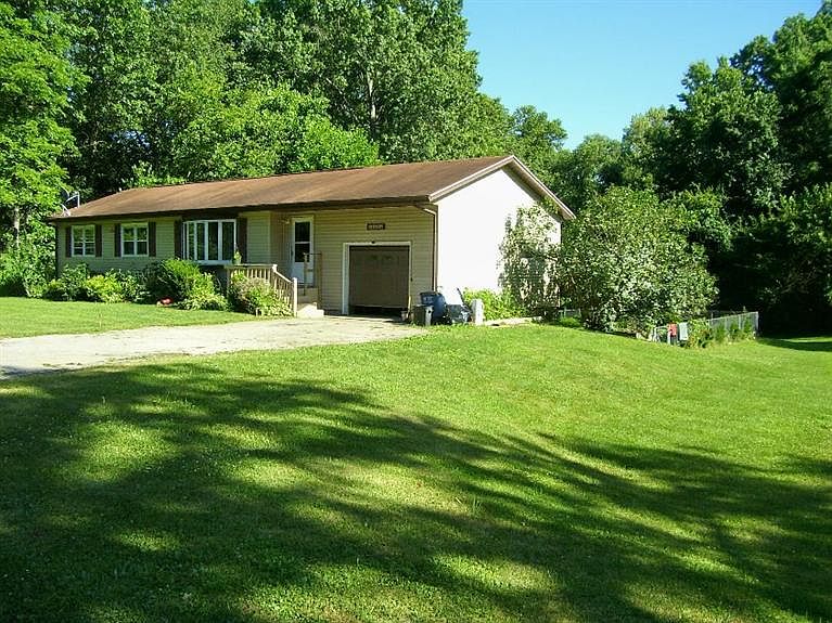 A ranch on 2 acres in New Prairie School district under $100,000. Comfortable size in the living room, eat-in kitchen that opens to the large deck. The 4th bedroom is currently used as a laundry room. The basement rec room is mostly finished and it has a 2nd kitchen. Flooring is needed. The home once had an in-ground pool but the liner has been removed, leaving the fence, decking and hole. Beautiful setting with woods to the back, past the storage shed. Home is in an estate and needs attention but it could be just what you want.