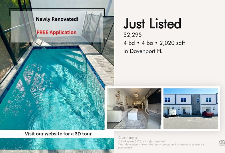 ** New listing with 10 Stars Property Management ** Beautiful 4 beds 4 baths is available for rent in Davenport, FL. Situated in Davenport, 388 Famagusta Drive is conveniently located near major attractions and amenities. The property is close to ChampionsGate, a well-known golf resort with upscale dining and shopping. Nearby, Posner Park offers various retail stores, restaurants, and entertainment options. The area is easily accessible via I-4, which connects you to popular destinations like Walt Disney World and other Orlando theme parks. Nearby recreational spots include Lake Davenport and local parks, providing outdoor activities. This location offers a blend of convenience and proximity to Central Florida's top attractions. 3D Tour Available: FREE APPLICATION Features: - Application fee will be credited back on the 1st month of rent if approved - Fully furnished for a hassle-free move-in - 2 storey townhouse offering spacious living - Vinyl flooring throughout for easy maintenance - Modern kitchen with stainless steel appliances and a peninsula island for a sleek cooking experience - Dishwasher for convenient kitchen cleanup - Ceiling fans for better airflow and comfort - Family area on the second floor for additional living space - Washer and dryer for laundry convenience - Master bedroom with its own master bath for privacy and relaxation - Swimming pool for enjoying the outdoors and staying active - Fenced backyard for privacy and outdoor fun - Part of the HOA Community - Tenant is responsible for paying all utilities Pets are allowed. No more than 2 pets per property. Weight limit of 55lbs per pet. No aggressive breeds. Applicants must complete a free pet application and have animal approved with vaccination record. The monthly pet fee will be determined by your pet screening score. Does not apply to medically/emotional support prescribed and/or service animals. At 10 Stars, we offer multiple services to make your stay with us easy and comfortable. We have a same-day application approval and a quick move-in for no additional cost. Our team is professionally trained and will be able to assist with any leasing, billing, or maintenance issues our tenants have. We also offer an emergency line available 24/7 for any urgent cases. Tenants have access to an online portal where they can make rent payments, communicate with our team and get updates on their payments and maintenance requests at all times. THE FIRST MONTH AND SECURITY DEPOSIT ARE REQUIRED Renter's insurance is required prior to moving in. Rules and Regulations are on our website! Only $65 non-refundable application fee per adult with 10 stars property management