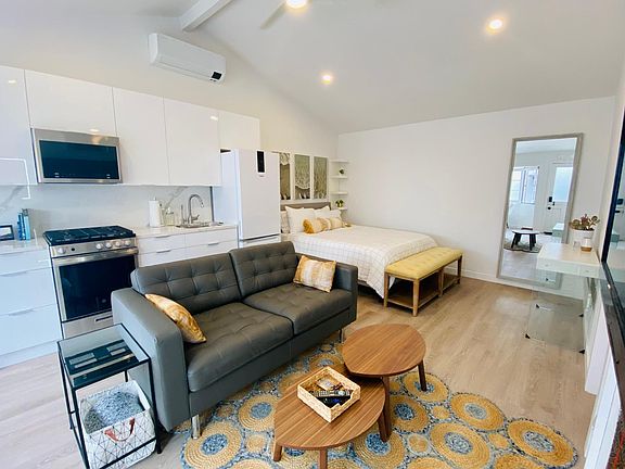 Newly completed and fully remodeled Laguna Beach furnished studio unit in the back of property with peekaboo ocean view and separate entry from the Alley. The unit features : An AC, porcelain tile floor, small walking closet, small full kitchen, reverse osmosis water softener for the unit with extra filter for drinking water, rain shower head at bath, LED mirror at vanity sink. Queen size bed for the sleeping area, separate dining nook, and designated loveseat for TV area. An Outdoor shared seating and exterior shower to rinse off the beach sand. The unit is conveniently located 2 blocks from Diver's Cove and about one mile north of Main beach/ Downtown Laguna, with walking distances to supermarket, coffee shop, gym and local bar and restaurants Minimum one year lease. No smoking inside the unit, all utilities included, add $50 extra for small pets.