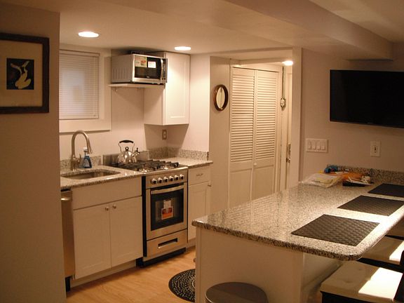 Newly renovated furnished studio with washer/dryer, air, on site parking, walk to NYC trains and buses. Tenant is responsible for gas and electric.