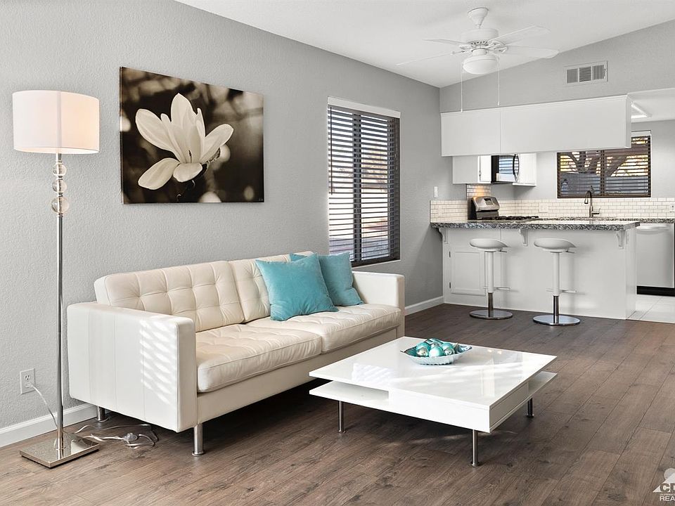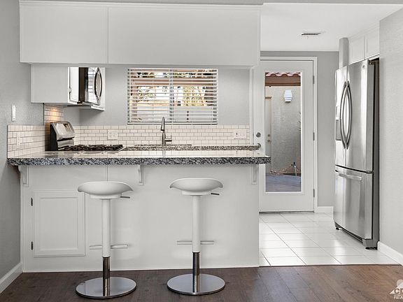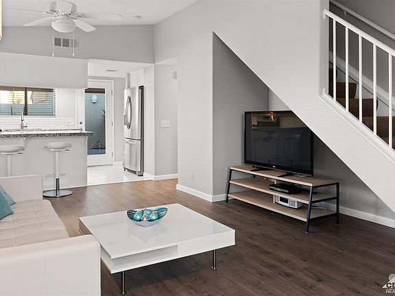 It's your lucky day! This amazing condo in Mountain View Falls has JUST been tastefully redone and is ready for you to call home. From the moment you walk in the front door of this in demand end unit, your senses will be awoken by the amazing newly installed laminate flooring. Upon laying your eyes on the absolutely stunning granite slab counters and subway tile backsplash you will be ready to make an offer, before you have even had a chance to see the spectacular master suite. All new stainless appliances including refrigerator. New professionally done paint throughout. Mountain View Falls is a quiet development with club house, pools, tennis courts, pickleball &basketball courts, and dog friendly (Attention dog lovers!!!).Amazing location with easy access to shopping, dining, etc. Perfect central Palm Desert location.