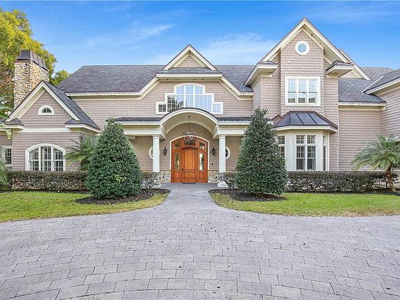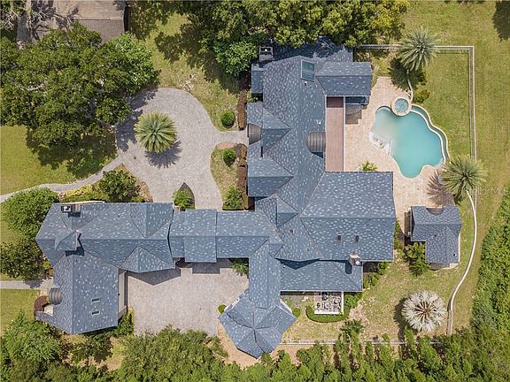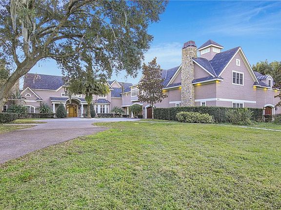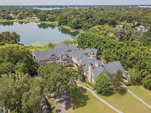 Featured as the show home of the Southeastern Builders annual conference, this stunning lakefront estate offers over 6,000 square feet of outdoor living. Go for a swim in the infinity pool, host a barbecue with the outdoor kitchen and bath, gather around the fire pit, go fishing off the private boat launch and gaze at the serenity of the sunset over Lake Anderson from the giant balcony. The car aficionado will love the eight-car garage and carport with recessed lights. This luxury estate provides over three acres of land with a separate mother-in-law suite that could offer potential rental income. Enter the mansion through the impressive solid wood entry door and you will find six primary suites, three kitchens, three fireplaces, multiple laundry rooms and a giant home theater with a food and beverage station. Take the elegant, curved staircase or the elevator to the second floor. You'll be impressed with the custom architectural details, crown molding, oversized windows, countless walk-in closets with built ins, plantation shutters, columns, French doors, custom imported wood floors, and elegant vaulted ceilings throughout. The gourmet kitchen showcases granite countertops, stainless steel appliances, a bread warmer, a pot filler above the gas stove, a center island, two sinks, glass door cabinets, a giant Electrolux fridge, coffered ceilings, and a safe room with a solid keypad entry door behind a cabinet façade. Wake up to a breathtaking lake view in the downstairs primary bedroom featuring pool access, a large walk-in closet with built ins, dual vanities, a soaking tub, and a beautifully tiled walk-in shower with body jets. Adjacent to the primary suite you will find a room with a cozy fireplace and hookups for a wet bar. Recent upgrades include multiple new AC units, mother-in-law suite renovations, an upgraded fire pit with pavers, manicured landscaping, fresh paint and tennis court installation. Close by downtown Orlando, Disney World, shopping and dining, this immaculate lakefront estate is truly one of a kind. View the 3D virtual tour or the walkthrough video, and call today to schedule a showing!
