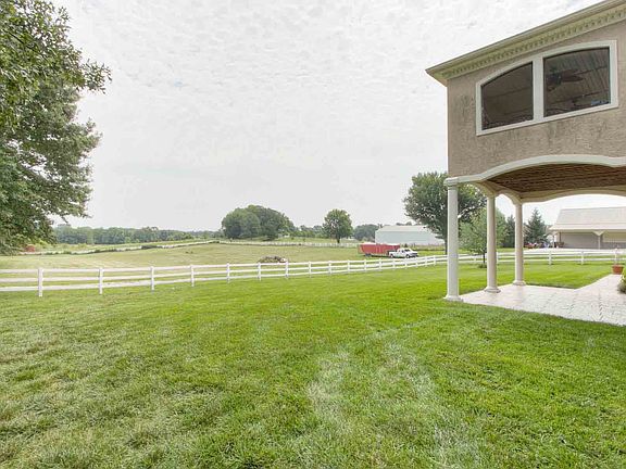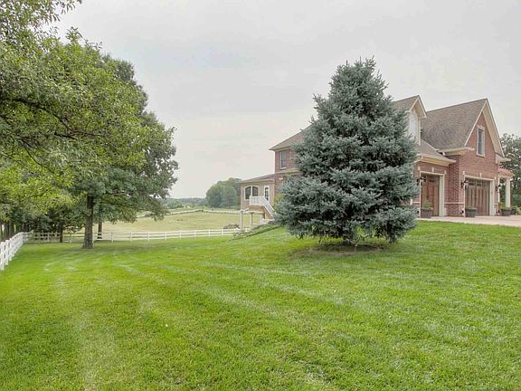 Gorgeous w/ approx 6800 Fin Sq Ft! Custom Brick w/ amazing view & lg outbuilding for those car/horse enthusiasts! Be amazed from large entry, room sizes & many custom finishes! Dining Room & Office conveniently located off entryway, huge & open great room, custom kitchen remodel, huge laundry, pantry/freezer area, warming drawer, subzero fridg, central vac sys. Many custom built-ins & trim work. Extraordinary Master Suite w/ room galore! Basement is perfect for entertaining! No restrictions, so bring your horses!