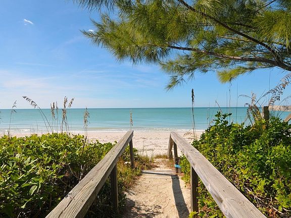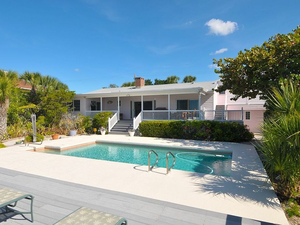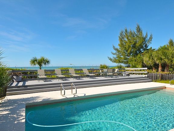 This is the perfect beach house getaway. Remember those carefree summer days along the shore? This Casey Key cottage allows you to relive those days year-round. Run barefoot along the sandy beach as the sun rises, welcoming you to another day in paradise. Take your coffee out to the deck and watch pelicans dive on baitfish while dolphins swim by in the cerulean waters, lapping rhythmically along the sand. Take the paddleboards down to the Gulf for an exhilarating experience among the waves and sun or go "bayside" through the deeded bay access, exploring and fishing along the mangrove islands. Dryman Bay has a rich array of wildlife that has flourished for thousands of years. The saltwater, heated, beachside pool and surrounding raised patio is the perfect setting for your tropical lunch, served under the shade of colorful beach umbrellas. Later the kids can play putt-putt golf while you take in a good book or snooze in your hammock, strung between swaying palm trees. This is the lifestyle you've been waiting for. The home is built on massive beams of solid old-growth hardwoods raised 14 feet above mean high tide, giving you the elevation needed on the beach. The exposed, vaulted ceilings along with the brick, wood-burning fireplace, accent the charm and cottage feel of this unique Casey Key residence. There is plenty of room for family and guests with the home's four bedrooms and five full baths, along with ample gathering spaces. Work from home in this enviable separate office that overlooks the Gulf. However you decide to spend the day, it is always crowned by enjoying a fabulous beachfront sunset from this private slice of heaven.