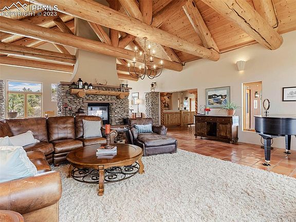 Superlatives fall short describing this ultimate, ranch estate with magical mountain views and a satisfying lifestyle enjoying resources that come from the land. With exquisite, southwestern architecture, the residence is characterized by earth-tones, wood beams, textures, and natural finishes. Architect Dave Elfrin thoughtfully designed the home with care and consideration to the authentic style, with numerous outdoor living spaces to soak in the setting. Nestled against a hillside, the sprawling 35-acre property features a garden oasis - rhubarb, pumpkins, squash, asparagus, plums, berries, and cherries - plus an orchard of 20 heirloom apple trees. The two-stall barn has been updated with electrical, insulation, heat, and a second story. Oh, and the chickens have their own heated “mini-mansion". A romantic courtyard with a fire pit and water feature leads to the covered, veranda entrance. The main level is oriented around a generously-scaled great room, showcasing a rustic beamed vaulted ceiling and large windows overlooking the scenic landscape. At the center of the room is a dramatic two-sided, river stone fireplace. On one side of the fireplace is the living area overlooking the mountains, and on the other is the open dining area. The kitchen is perfectly complimented by colorful Trevera tile, butcher block countertops, wooden cabinetry, and stainless-steel appliances. Main-floor living is perfected by a generous home office and huge owner’s suite, with mountain views, an adobe fireplace, and soothing bathroom with dual sinks, a large walk-in shower with river stone, and a walk-in closet. The lower level features an adobe fireplace and plenty of room for a sitting area, game table, and bar. A wall of windows overlooks the waterfall, splashing from the courtyard above. The patio, with hot tub, firepit, waterfall, and pergola, this is the perfect spot to unwind and watch the sunset over the mountains.