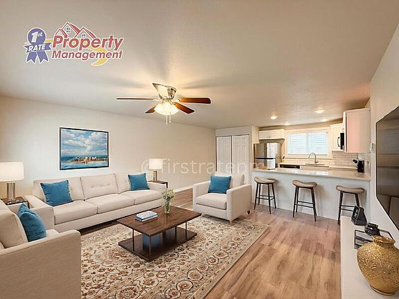 The kitchen has stainless appliances including a refrigerator, dishwasher, microwave, and stove. Full sized Washer/dryer hookups available! The backyard is fenced and shared with adjoining units. For parking, there is one assigned carport space, driveway and additional street parking available for guests. The carport also includes an exterior storage room to maximize storage!