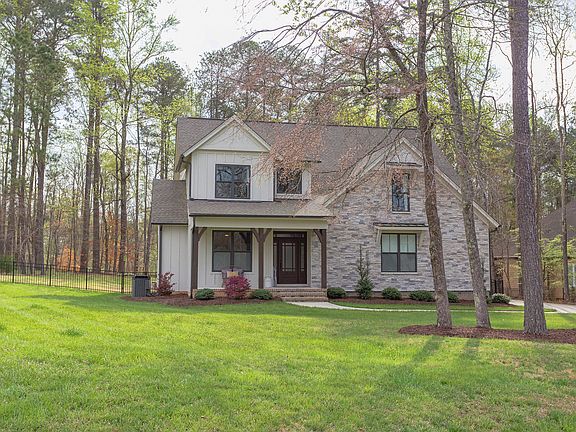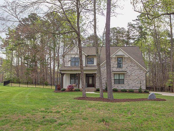 Better than new! Steven Hayes Custom farmhouse in highly desirable Silverleaf - Minutes from Wake Forest! True custom on private & pristine fully fenced lot backing to woods! Grand 1st floor primary suite w/true luxury bath, huge WIC & 1st floor In-Law suite w/adjacent full bath/tiled shower. Site finished Cumuru hardwoods including primary suite, custom window treatments & details/custom touches galore. Chef inspired gourmet kitchen w/gas range, downdraft, huge granite island, pantry & custom cabinetry. Open & inviting with an abundance of natural light & pristine views! 2nd floor features (2) additional huge bedrooms, office & unfinished flex room ready to be easily finished for additional living space! Gorgeous covered and vaulted rear porch, Trex deck, Architectural up-lighting make this gem truly perfect for everyday living and entertaining. MOVE IN READY! Please see 3D tour link