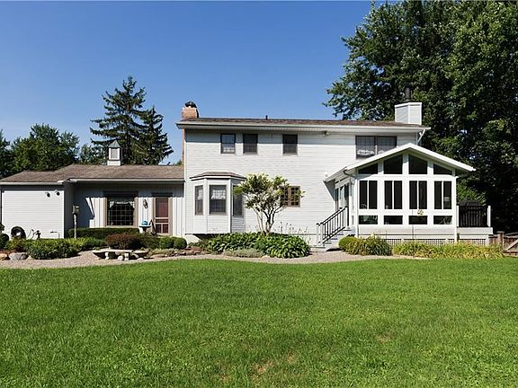 This Colonial and 8+ acres is right out of a country magazine! Current owners built this with incredible thought and attention to every detail. Hand hewn beams, beautiful moldings & built-ins, 7' wide white pine plank floors throughout, hand made light fixtures from Sturbridge and 3 fireplaces all add to the charm of this home. The spectacular family room with cathedral ceilings, a brick Rumford fireplace with a bread stove is open to the kitchen and eating area. The beautiful kitchen boasts stainless Jenn-Air appliances & Titanium granite countertops. The living room and den both have gas fireplace. The stunning 3 season sunroom overlooks the spectacular back yard, a courtyard, 2 patios, a chicken coup and fire pit, and wooded nature trails. The finished basement offers a family room, an exercise room, and workshop. This village edge property is both an entertainers and a nature lovers dream. Property has natural gas, public water, central-air, and is semi-smart house with award winning Skaneateles schools right down the road.