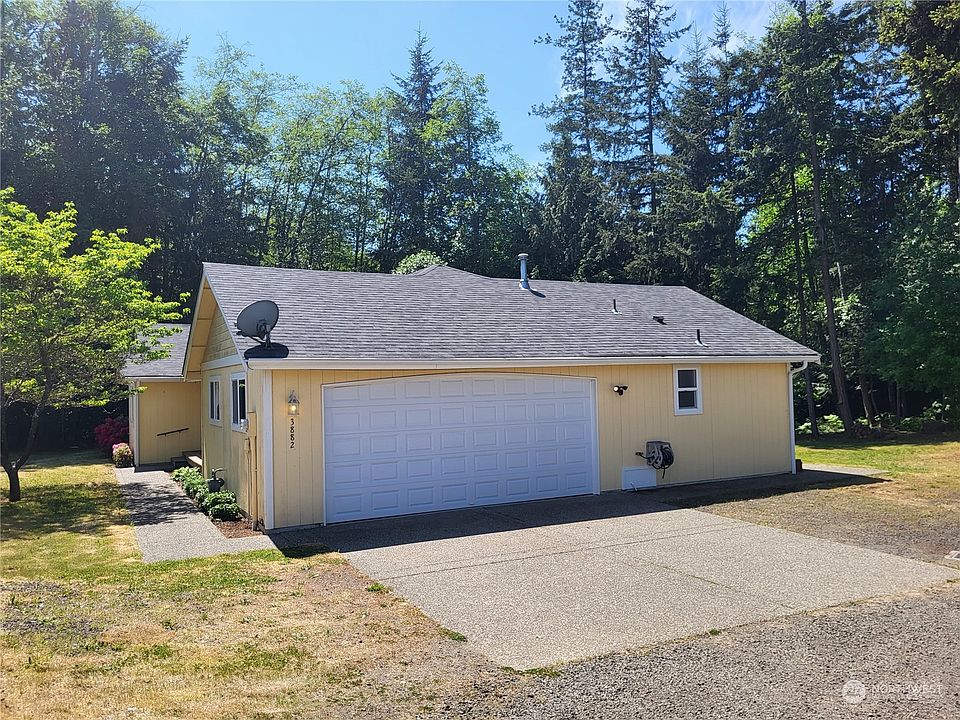 Well-maintained, move-in ready, rambler on close to an acre, offering not one, but two primary suites each with their own full bath and walk in closest! Open concept floor plan that flows from the kitchen to a family room. Bedroom French Doors open to the back patio with views of the property. Gardener's delight with plenty of space for a dream garden. Want storage? Not one, but 2 two car garages! Upgrades and features include A/C, leaf guard, security system, RV parking, and wired-in generator. Conveniently located to 16 and amenities.