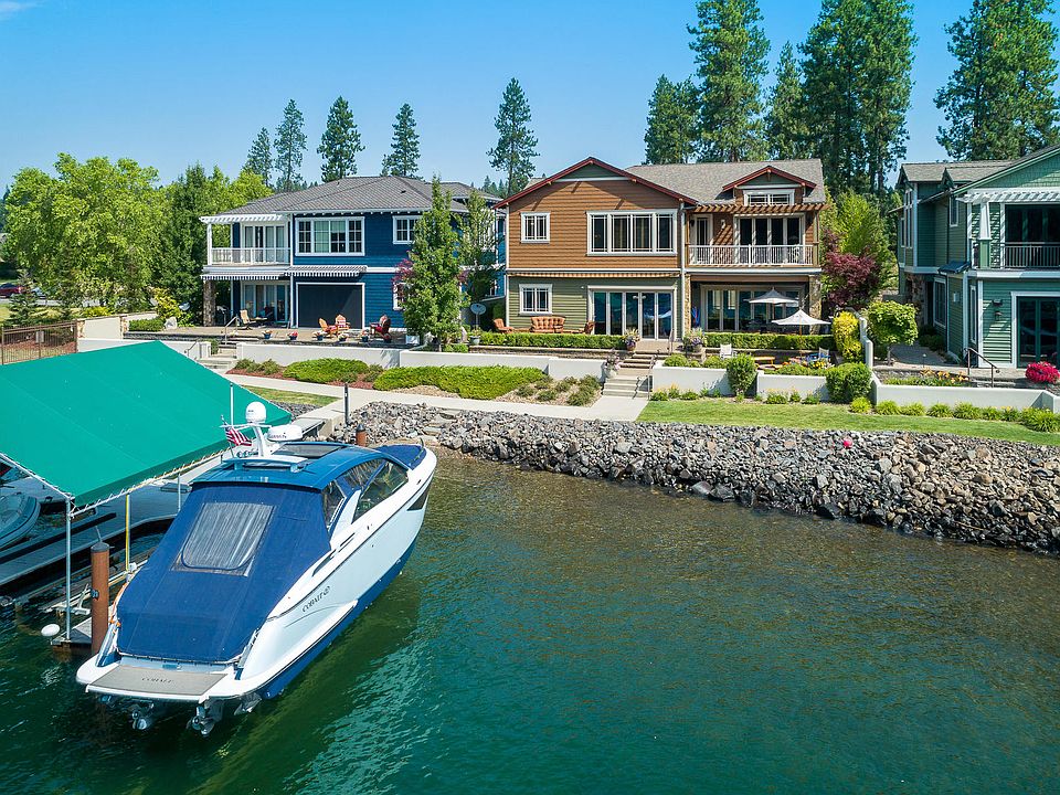 Panoramic waterfront Views! Located in the highly desirable gated community of Rivers Edge in Mill River. This property integrates the finest in luxury living with the natural beauty of its surroundings. situated along 65 ft of water frontage this home features a full wall of retracting Nano wall doors that open up to a spacious patio with retractable awnings & electric nano door screens for indoor/outdoor living, two electric boat lifts with shore power and covered canopy. Inside features include a gourmet kitchen complete with Wolf Stove & Granite countertops. Master bedroom features a fireplace, Nano doors that open to the private deck overlooking the water, dual vanities, walk-in shower, jetted tub, & walk-in closets. All situated within close proximity to all that Cda has to offer.