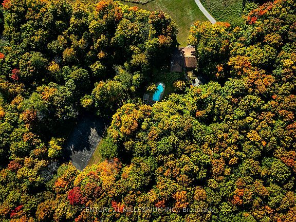 Discover a private 45-acre family haven in Mono that seamlessly blends natural splendor and city views. Pass through stately iron gates to uncover a delightful outdoor haven, featuring a sparkling heated pool, inviting bar, tennis court, and unlimited trails amidst mature trees. The home welcomes with an open, friendly floor plan, two generous bedrooms, a hearty dining space, and a warm living area accentuated by a grand fireplace. Enjoy the comfort of a renovated kitchen and bathrooms, all designed for modern living. The large windows and covered porch offer uninterrupted, captivating views. On the lower level, you'll find a spacious rec room complete with an additional fireplace, two more bedrooms, and a fresh, new bathroom. This home also features a spacious two-car garage. With proximity to Mansfield Ski Club and Hockley Resort, anticipate enjoyment in all seasons at this exquisite Mono home that's waiting just for you. Your enchanting sanctuary in Mono is ready and waiting.
